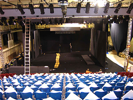 Stage construction continues with the placement of black carpeting and black curtains.