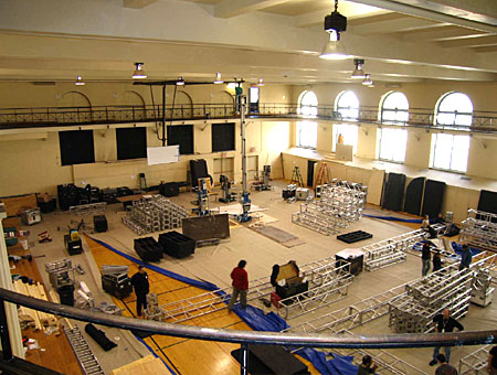 Assembling the trussinga metal framework that will act as the grid on which to hang lighting equipment.