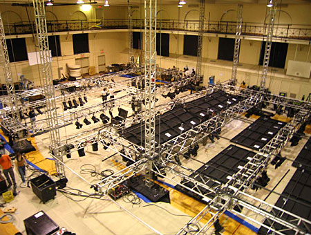 Hanging lighting instruments before the trussing is lifted upright.