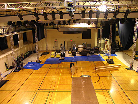 With trussing and lighting in place, a layer of plastic is rolled out to protect the floor before risers and stage are built.